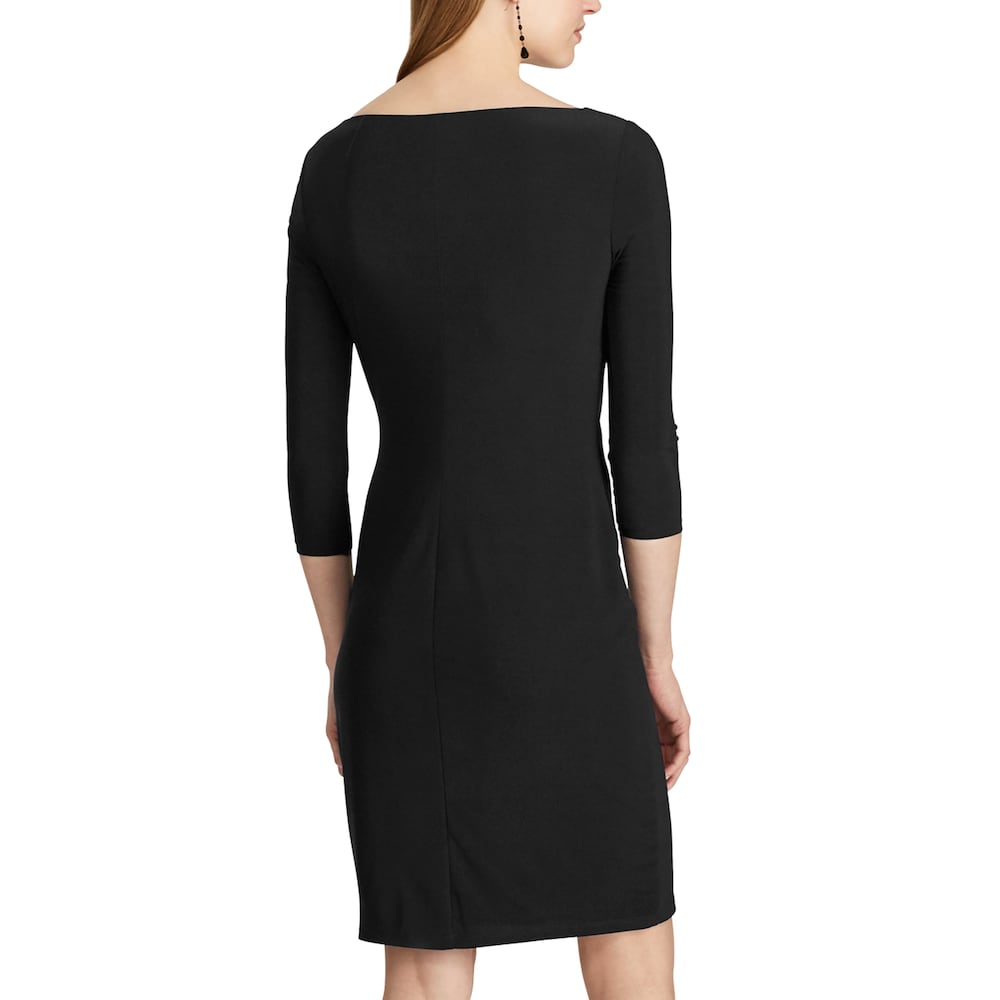 A stunning style for evening, this slim-fitting jersey dress features luxe satin trim and a cascading ruffle.